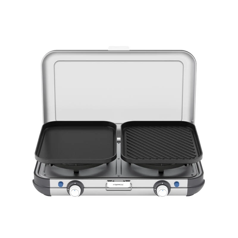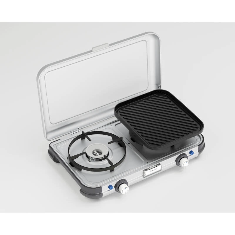Conçu pour le campeur souhaitant un Réchaud 2 feux, compact et polyvalent, aves ses 2 plaques de cuisson interchangeablesLe nouveau kit Camp & Grill CV est un compagnon de cuisson et de grillade compact et polyvalent. Le réchaud 2 feux avec grilles de saisie et plancha interchangeables vous satisferont pendant vos repas