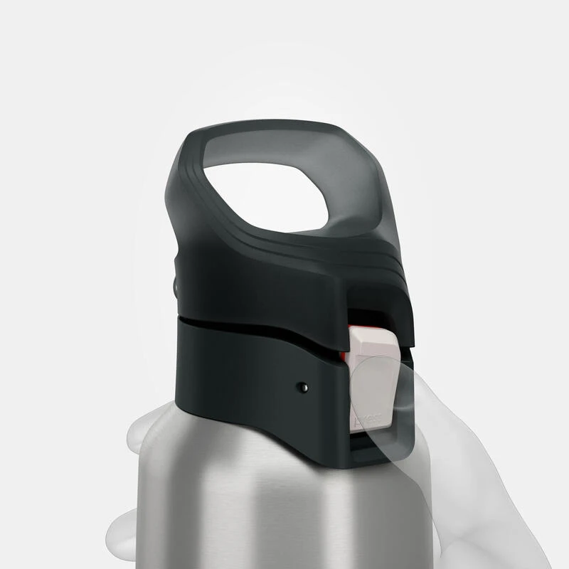 Le bouchon s’ouvre facilement à une main en appuyant sur le bouton blanc à l’endroit marqué « PRESS ». Lors du transport il est possible de verrouiller ce bouton en glissant le bouton blanc vers le bas. Un espace rouge apparaît alors indiquant que le bouchon est verrouillé et il n’est plus possible d’appuyer.